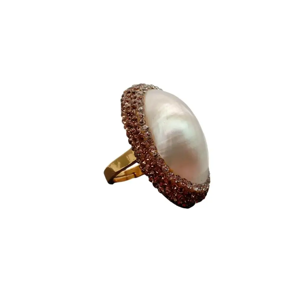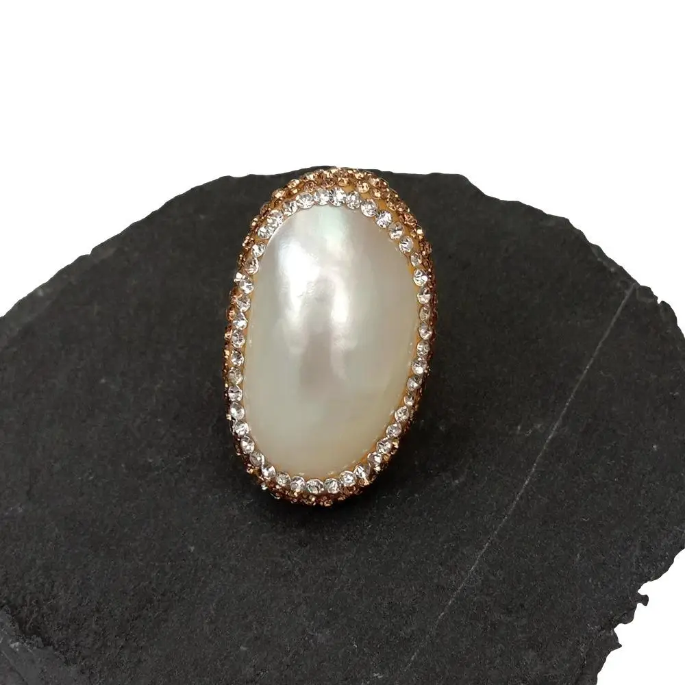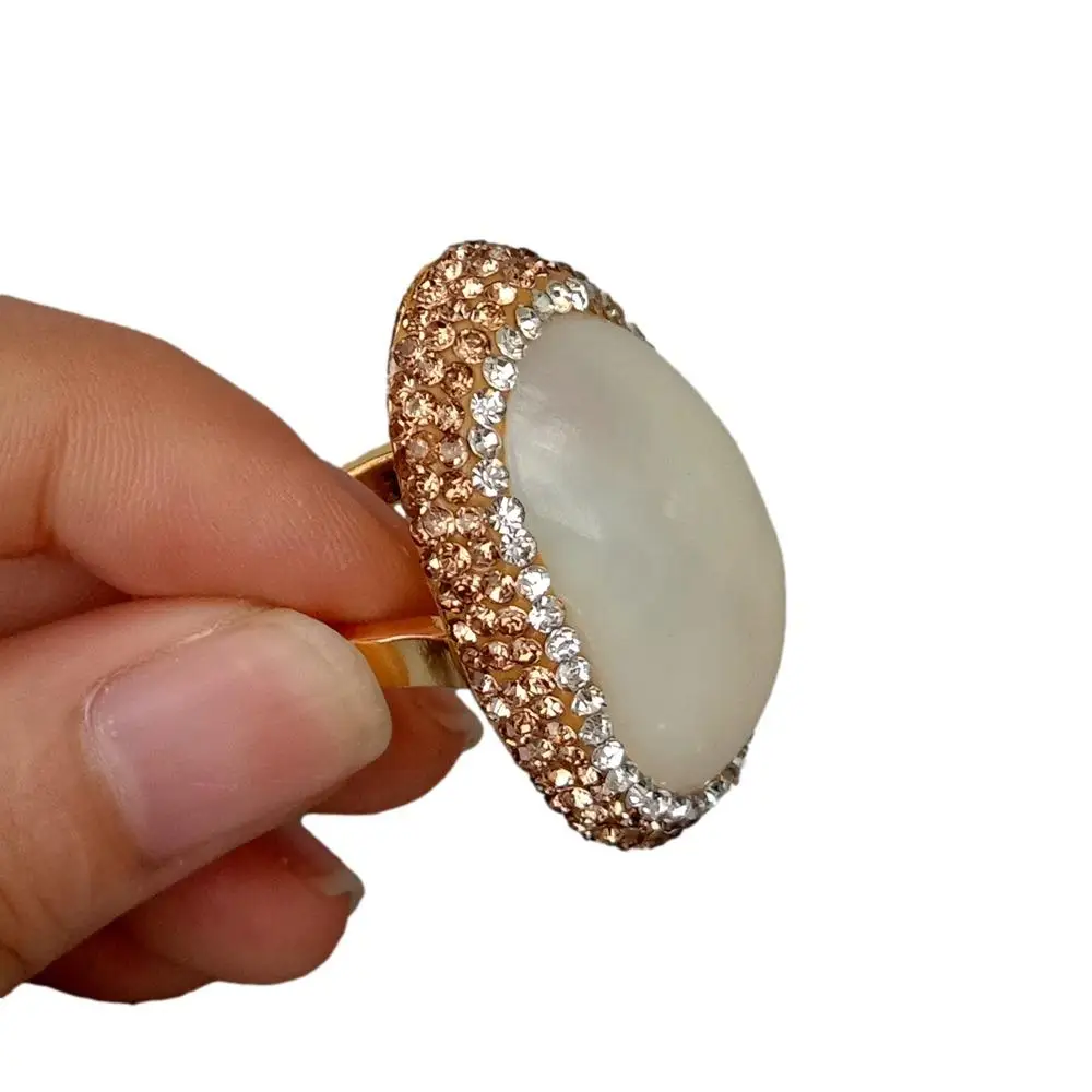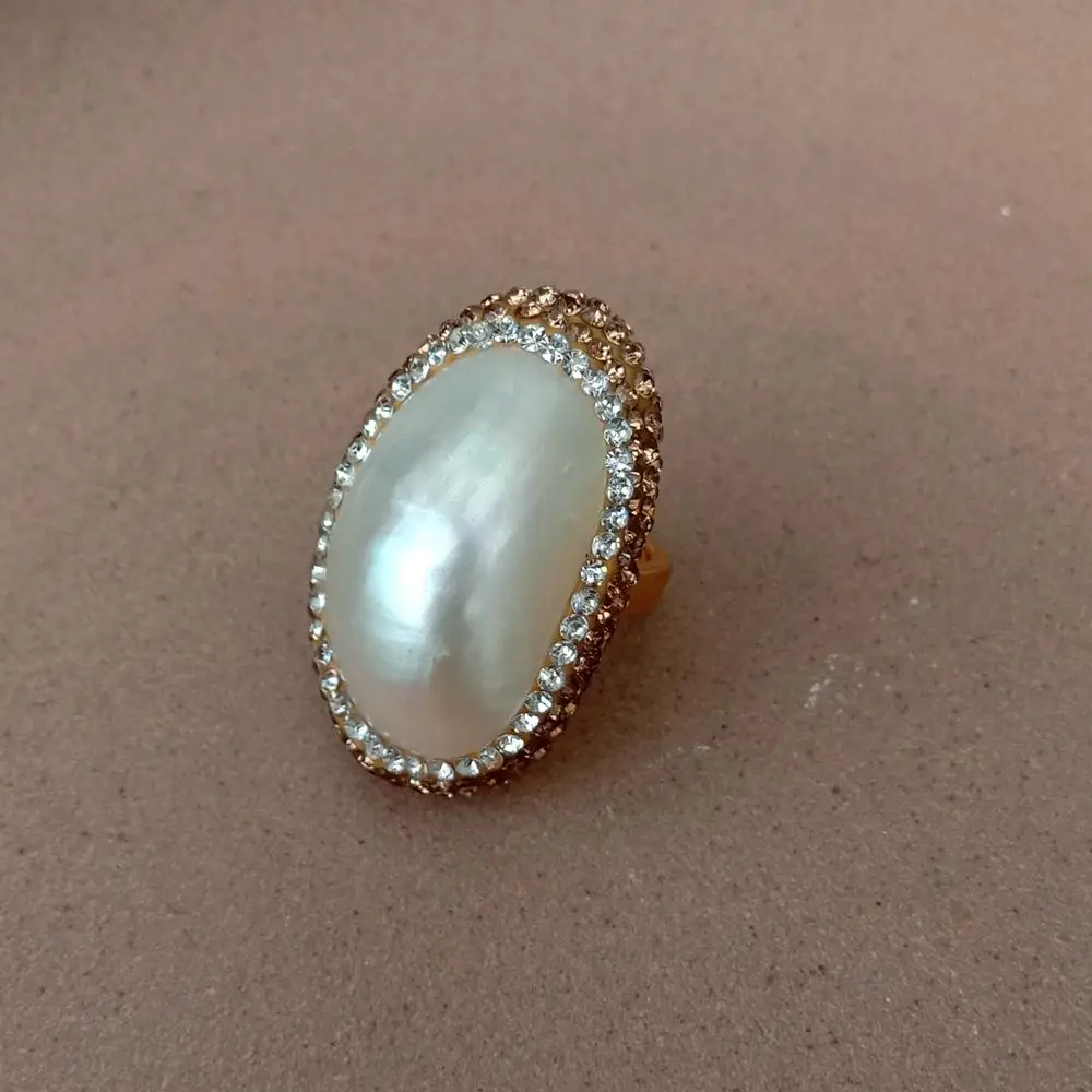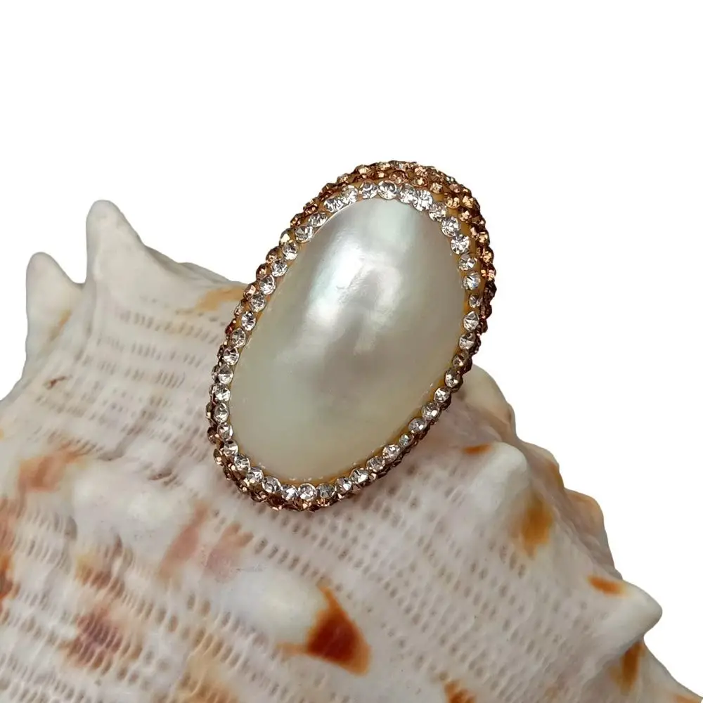 Y·YING Natural White Shell Trimmed With Golden Crystal Ring Adjustable